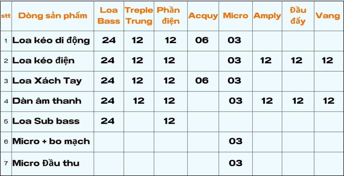 BẢNG QUY ĐỊNH CHI TIẾT THỜI HẠN BẢO HÀNH: (Tính từ ngày mua hàng) như sau: Đơn vị tính: tháng