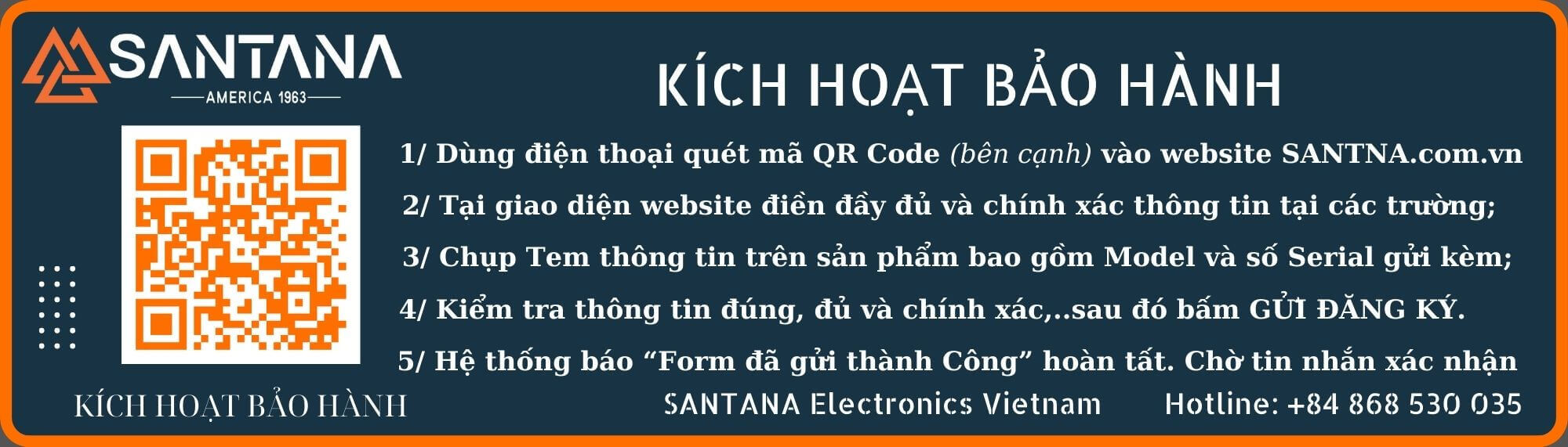 2 Tất cả sản phẩm mang thương hiệu SANTANA trên thị trường trong nước và Quốc tế nếu không được đăng ký kích hoạt bảo hành điện từ và không nhận được thống báo xác nhận chính hãng từ SANTANA Electronics Vietnam đều là sản phẩm GIẢ hoặc NHÁI.